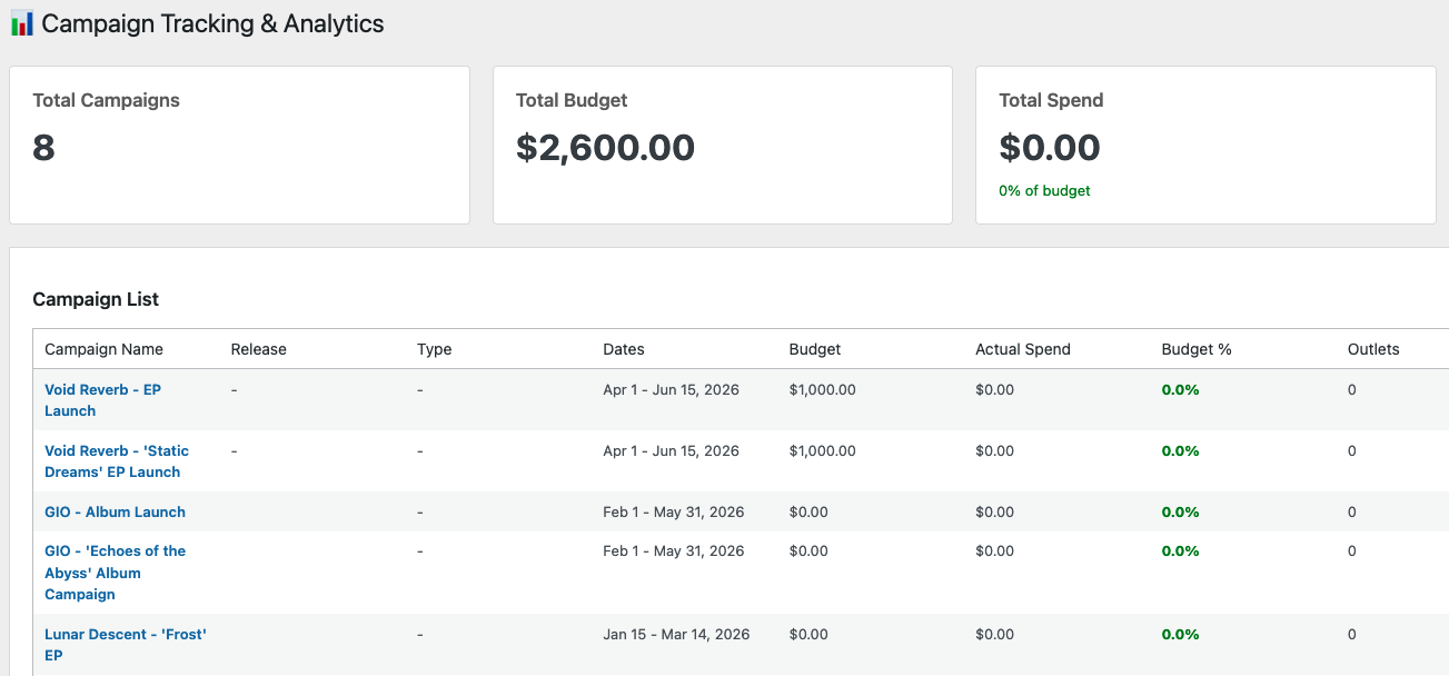 Track every artist, release, and campaign in one place. No more scattered spreadsheets.