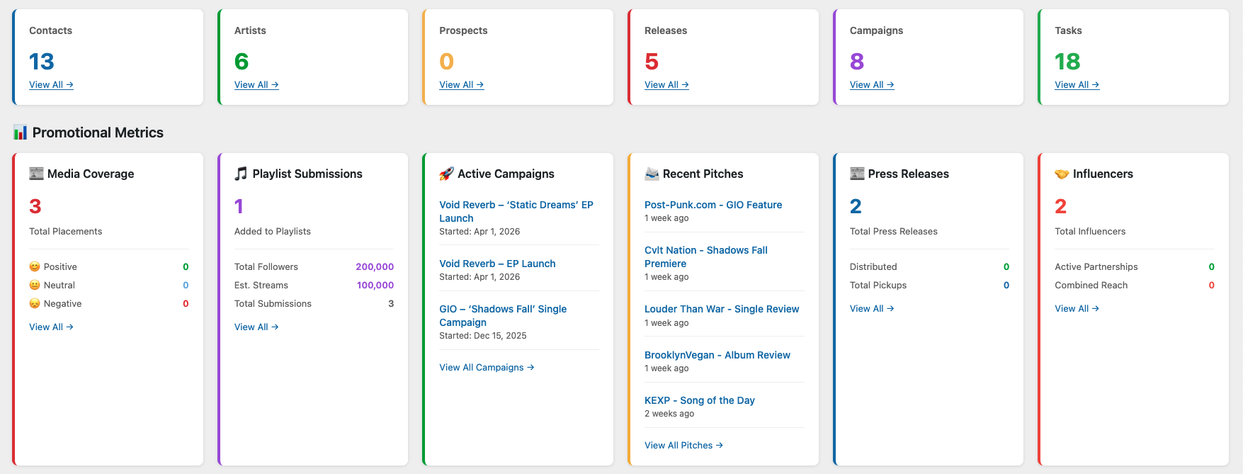 Track campaign budgets, email open rates, media coverage, and ROI. Export reports for clients or investors. Know what’s working so you can do more of it.